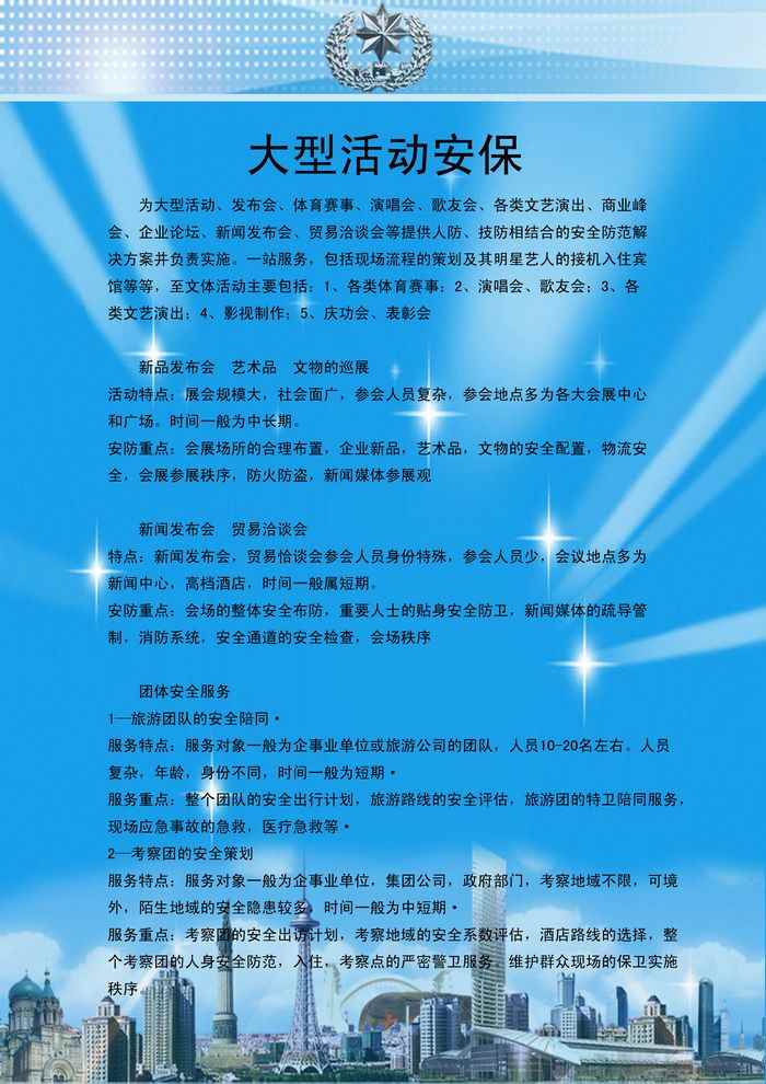 為大型活動、發布會、體育賽事、演唱會、歌友會、各類文藝演出、商業峰會、企業論壇、新聞發布會、貿易洽談會等提供人防、技防相結合的安全防范解決方案并負責實施。一站服務,包括現場流程的策劃及其明星藝人的接機入住賓館等等,至文體活動主要包括: